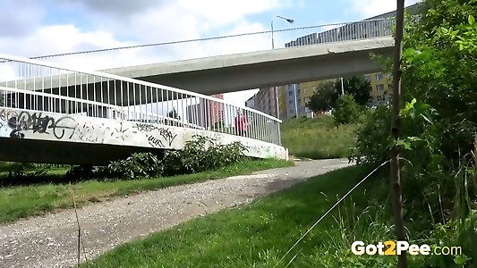 gambe lunghe raven haired ragazza urinato un mazzo enorme ponte stradale